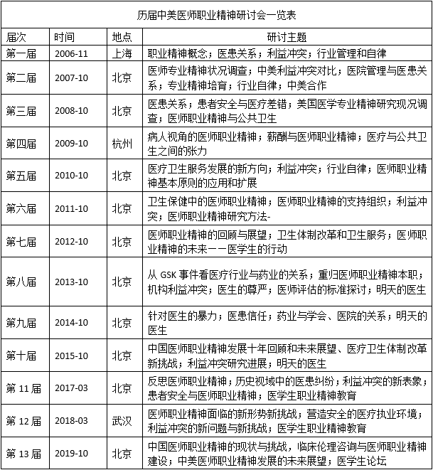 经著名卫生经济学家哈佛大学教授萧庆伦(William Hsiao)介绍,北京大学医学部医学伦理学教研室与哥伦比亚大学医学专业研究中心(IMAP)建立了联系。在彭瑞骢、王德炳等校领导的大力支持下,教研室邀请IMAP中心主任David Rothman夫妇、哈佛大学卫生政策研究专家David Blumenthal一行于2005年秋访问北京,与李本富教授领导的工作团队调研和讨论中国医师职业精神。在上海医学伦理学会、山东大学医水仙直播 、西安交通大学医水仙直播 等单位的帮助下,中美双方专家分别在北京、上海、西安和济南,对这几个重要城市的医患关系、医师执业状况、医学伦理和卫生体制改革等问题进行了深入调研。在此基础上,双方决定举办系列研讨会,推动职业医师精神研究深入发展。2006年11月3-4日在上海召开了首届中美医师职业精神研讨会,之后每年定期举办,至2019年已连续举办十三届。